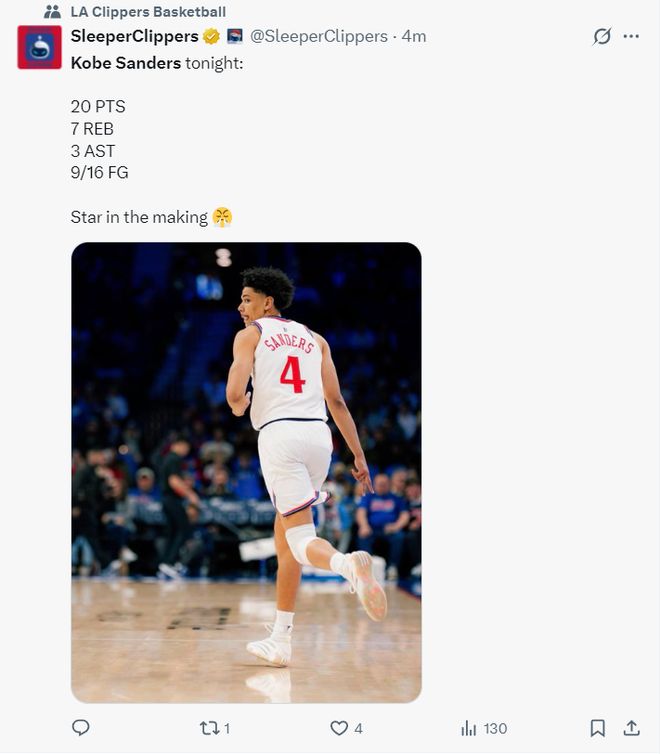 快船记者Lauren Rosen:桑德斯三节拿到20分已经创造生涯新高,微波炉球员。