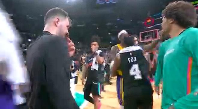 即便终场哨声早已吹响,湖人和马刺两队在弗罗斯特银行中心球馆的火药味仍未消散。本场比赛湖人以91-107不敌马刺,三连胜的势头被终结。当两队球员陆续离场时,湖人前锋范德比尔特与马刺前锋索汉发生口角争执,随后范德比尔特伸手戳向索汉的面部,这一举动立刻引发马刺前锋朱利安・尚帕尼的不满,后者直接上前将范德比尔特推开,双方球员险些因此爆发大规模斗殴。