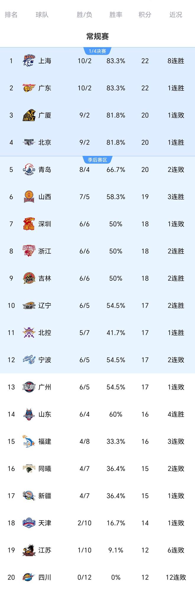 随着浙江大胜广州,吉林逆转福建,山西翻盘,CBA最新积分榜乱了