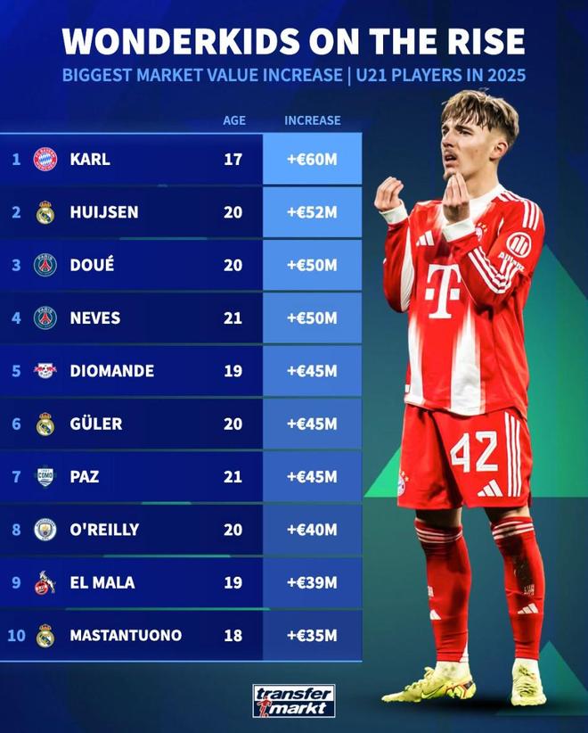 德转列U21球员2025年身价涨幅榜:卡尔、赫伊森、杜埃前三